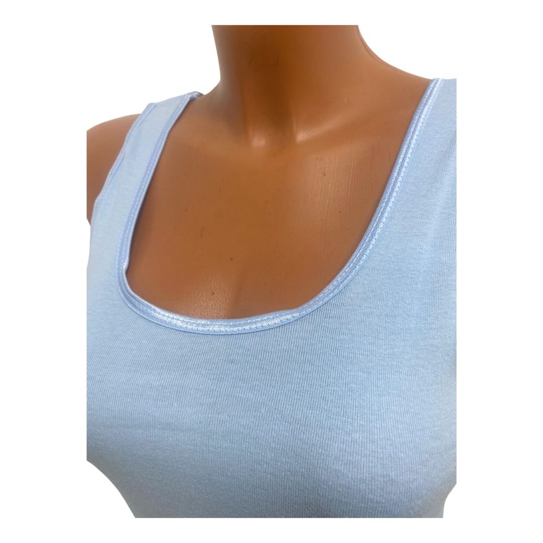 2 Pack Top kwaliteit dames hemd – 100% katoen – Lichtblauw. Dames regular hemd. Materiaal bestaat uit 100% katoen, hierdoor is het onderhemd vocht absorberend. Deze tanktop is ideaal voor tijdens warme zomerdagen, voor dagelijks gebruik. Het hemd heeft een comfortabele pasvorm, zit lekker aan de lijf en blijft goed na het wassen vinden de meeste klanten. Ook rekken ze mee in de breete tot 10 cm meer en zijn slim fit. Dit hemd heeft geen zijnaden waardoor het hemd zeer comfortabel voelt. Deze dameshemd heeft brede bandjes waardoor het lekker zit aan de schouders. Ze zijn verkrijgbaar in diverse maten en 11 kleuren. Deze tanktop worden geleverd in een pack van 2 stuks.