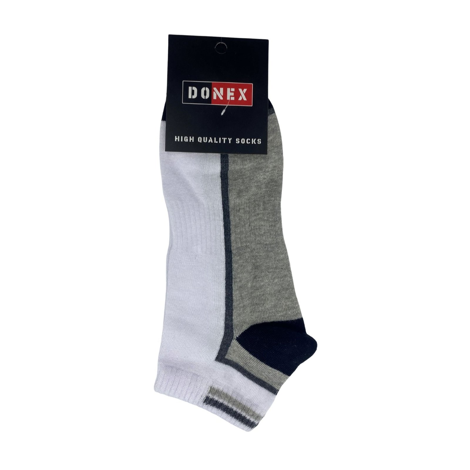Set van 8 Paar Donex sneakersokken  Katoen in het kleur Wit met Grijze of blauwe onderkant van de voet. Deze sneakerssokken is een kort model. Heeft een huidvriendelijke draagcomfort en bestaat uit een mix van katoen waardoor die de belastingzones versterkt. Door de 80% katoen is deze sneakersokken ademend en zeer comfortabel om te dragen. Verder hebben deze sokken een uitstekend draagcomfort dankzij de fijne afwerking zonder voelbare teennaad. De sok is in het midden voorzien van een elastische band, waardoor do sok altijd goed om je voet blijft zitten en niet afzakt. De sokken zijn unisex dus zowel geschikt voor